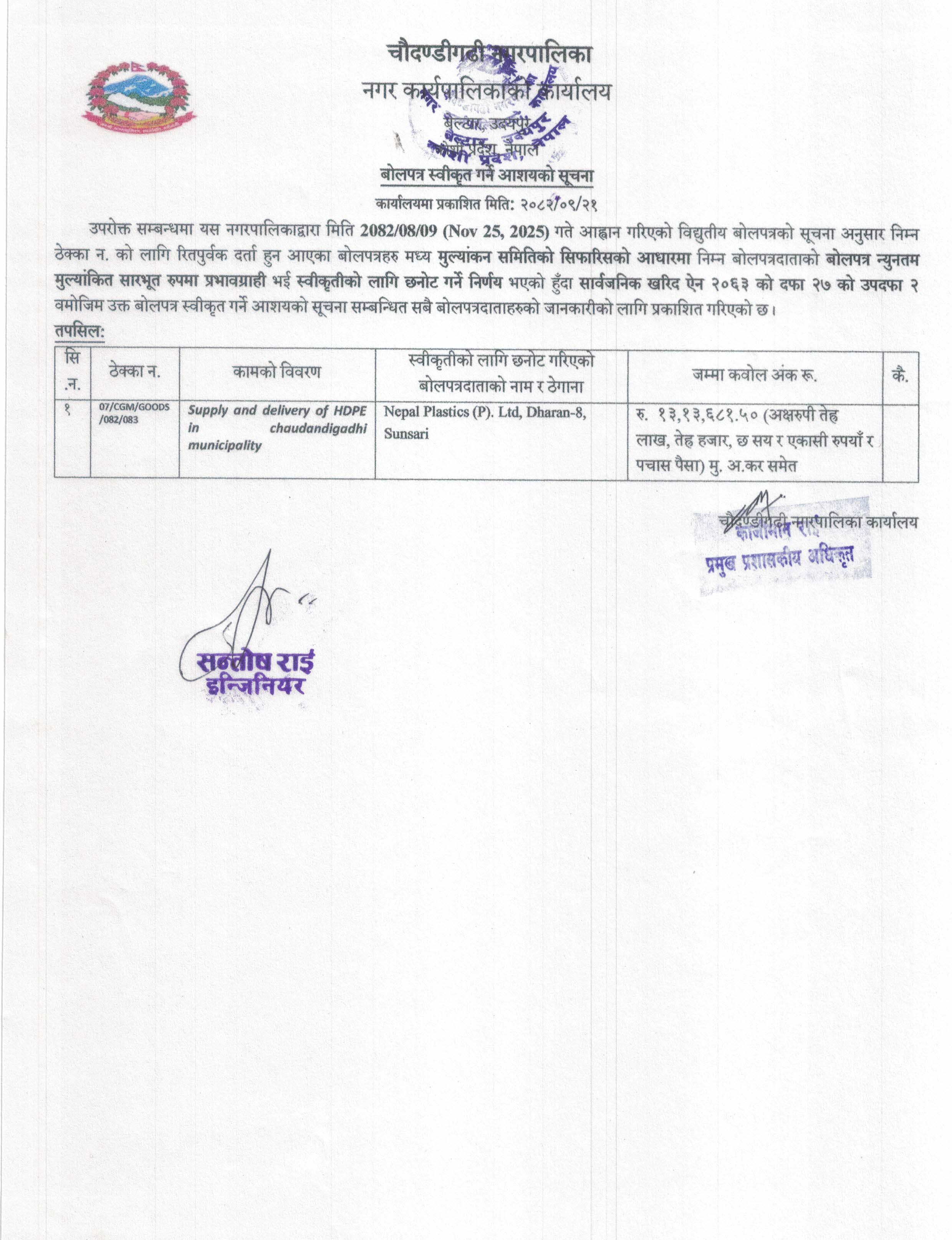 बोलपत्र स्वीकृत गर्ने आशयको सूचना कार्यालयमा प्रकाशित मिति: २०८२/०९/२१
