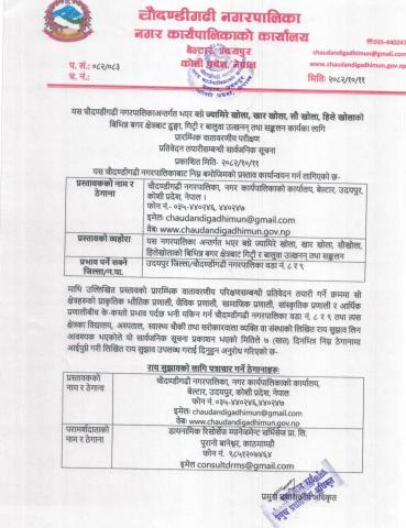 यस चौदण्डीगढ़ी नगरपालिकाअन्तर्गत भार बग्ने ज्यामिरे खोला, खार खोला, सौ खोला, हिले खोलाको बिभिन्न बगर क्षेत्रबाट दुङ्गा, गिट्टी र बालुवा उत्खनन तथा सङ्कलन कार्यका लागि प्रारम्भिक वातावरणीय परीक्षण प्रतिवेदन तयारीसम्बन्धी सार्वजनिक सूचना