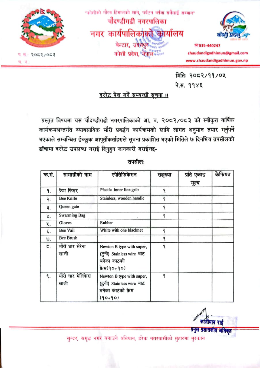 विपद व्यवस्थापनका लागि सामाग्री खरिद गर्ने लागत अनुमान बनाउने प्रयोजनार्थ प्रकाशित भएको ७ दिने सूचना