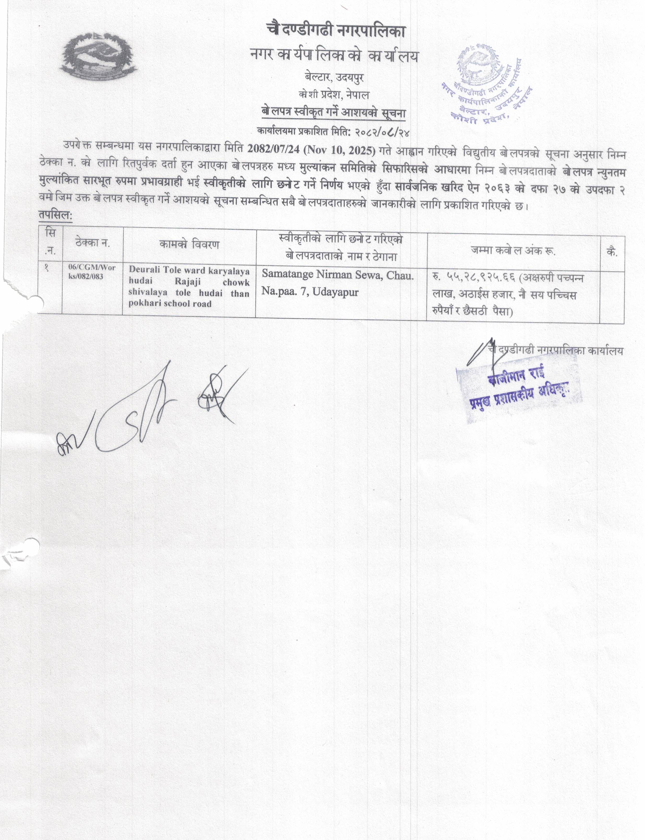बोलपत्र स्वीकृत्त गर्नेआशयको सूचना ।