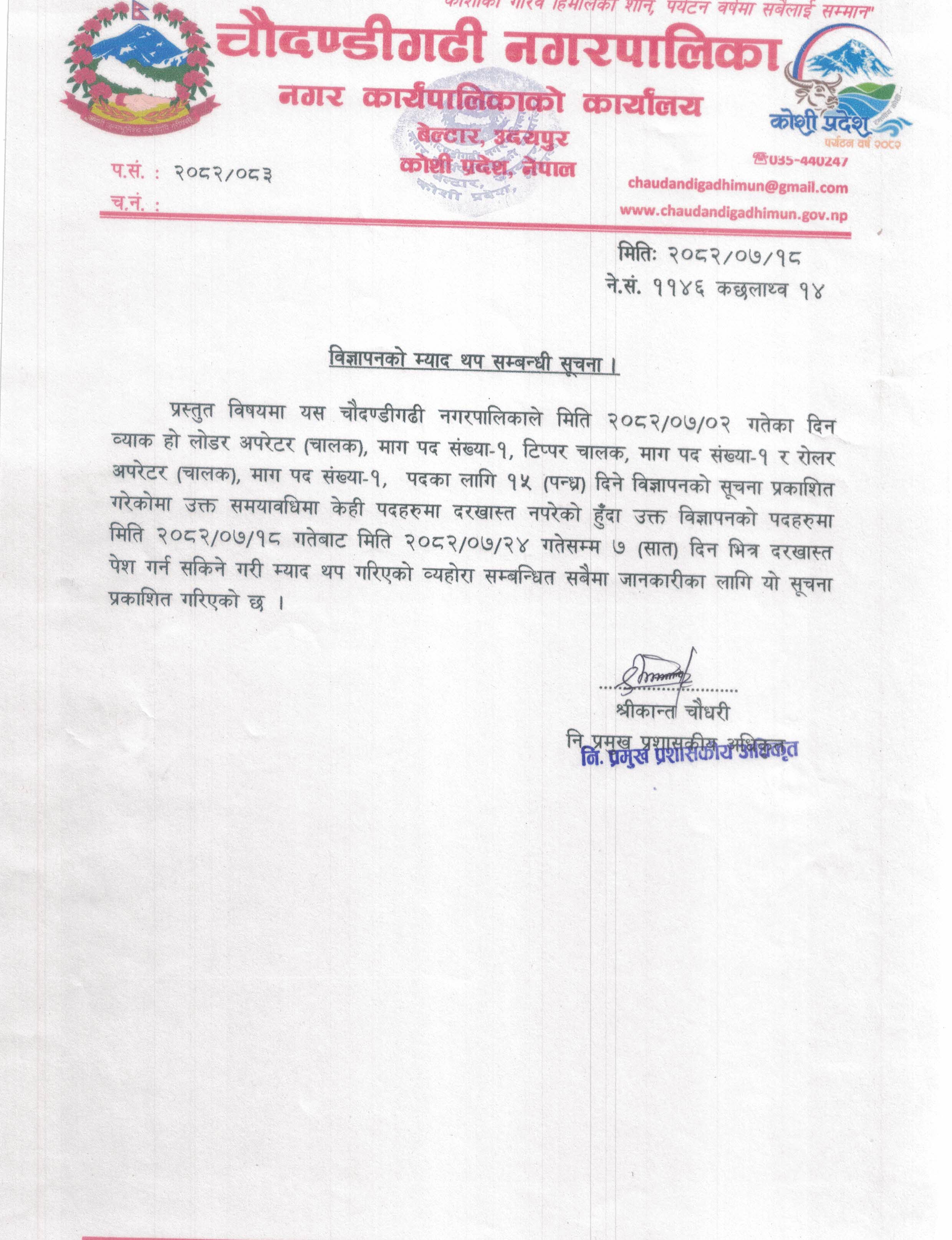 विज्ञापनको म्याद थप सम्बन्धी सूचना ।